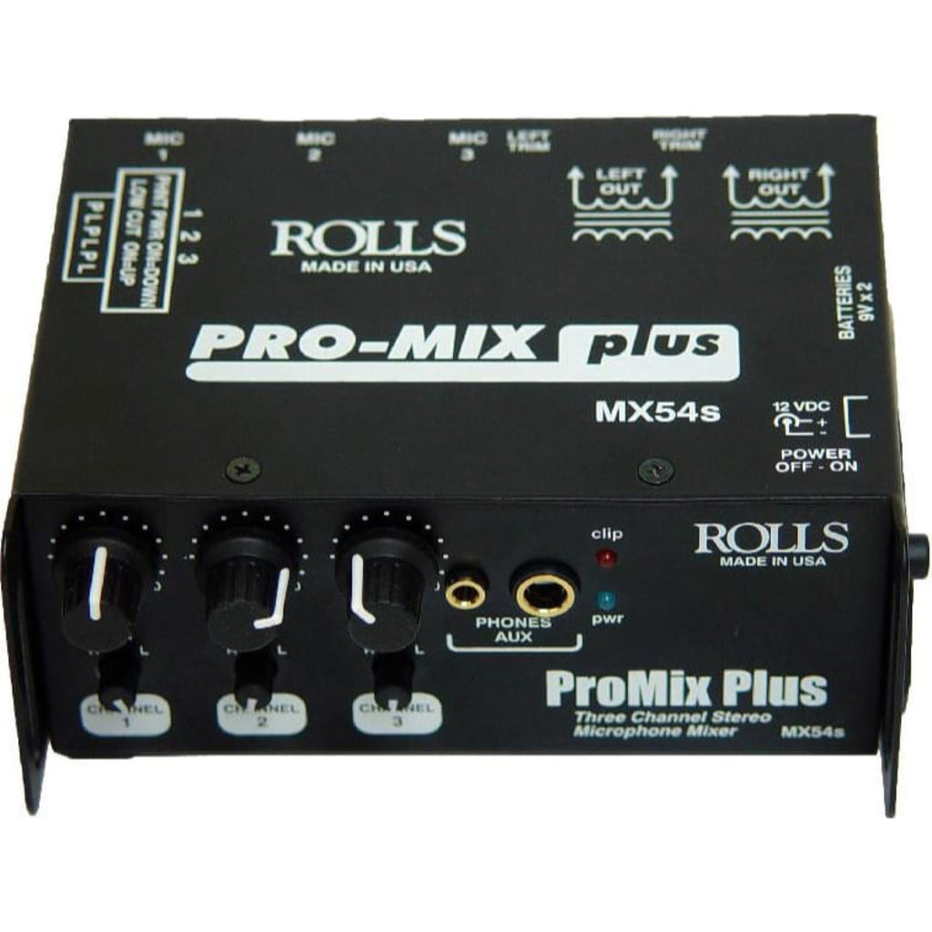 The MX54s Pro-Mix Plus mixes three microphones into two transformer balanced outputs. It has three XLR inputs, each with individually switchable phantom power, and Low Cut switches, a Level control, and a Pan control. As mentioned, it has two transformer balanced, XLR outputs. A 1/4 inch Aux/Headphone output has been provided along with a Clip indicator, Power indicator, and Power switch. The unit is also powered by two 9-Volt alkaline batteries.