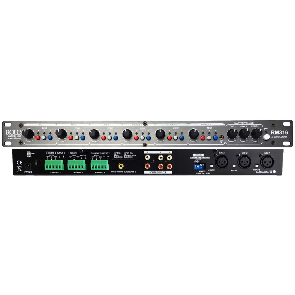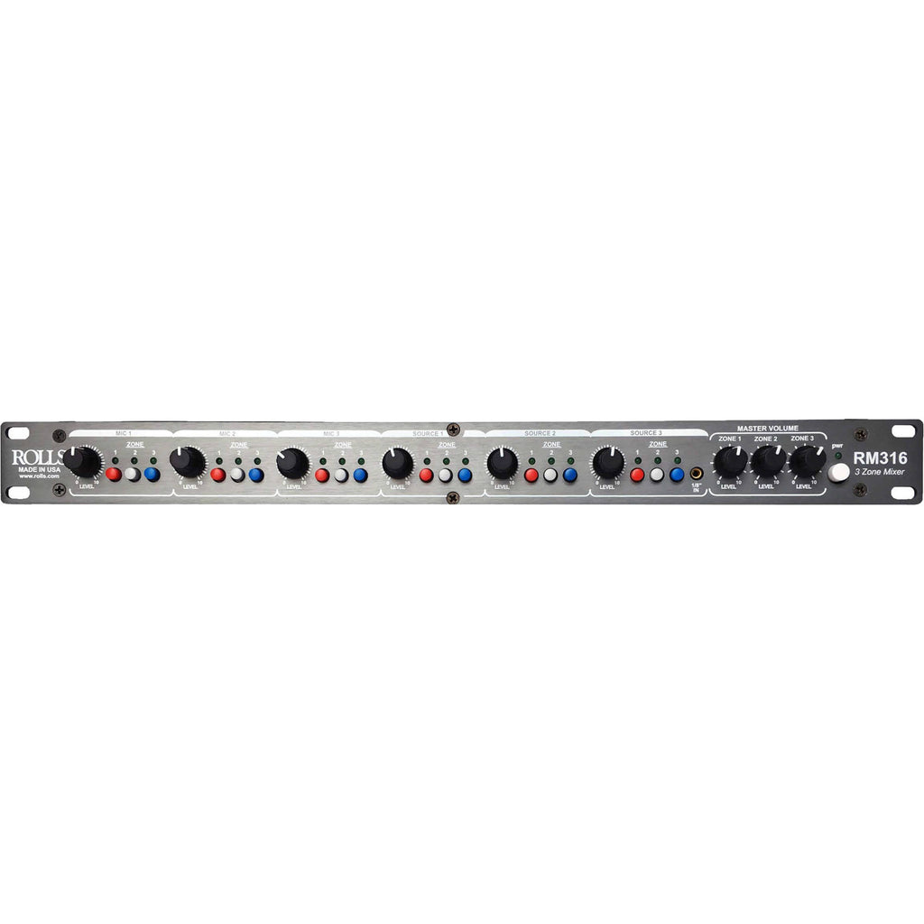 The new ROLLS RM316 Three Zone Mixer combines three microphones or XLR line level signals with three RCA line level source inputs.