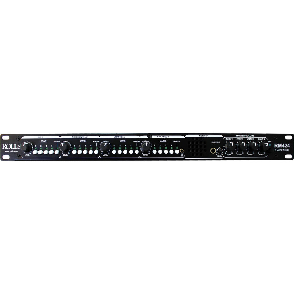The new ROLLS RM424 Four Zone Mixer combines two paging microphones with two line level source inputs. Each input is switch selected to output to any combination of four zone outputs. The outputs are all balanced XLR connectors, Remote Volume provides each zone with the means for external volume control. The Microphone inputs feature selectable ducking for paging. Front panel speaker makes pre assignment monitoring for each channel possible with individual switching for each channel. The RM424 is easy for anyone to use from the front, but from the rear it is just complex enough it will fill even the most demanding four zone installation requirements. With the included external power supply the RM424 has just about every approval known to man so you can spec it in almost any installation. The RM424 is the ideal solution for restaurants, offices, night clubs, etc.