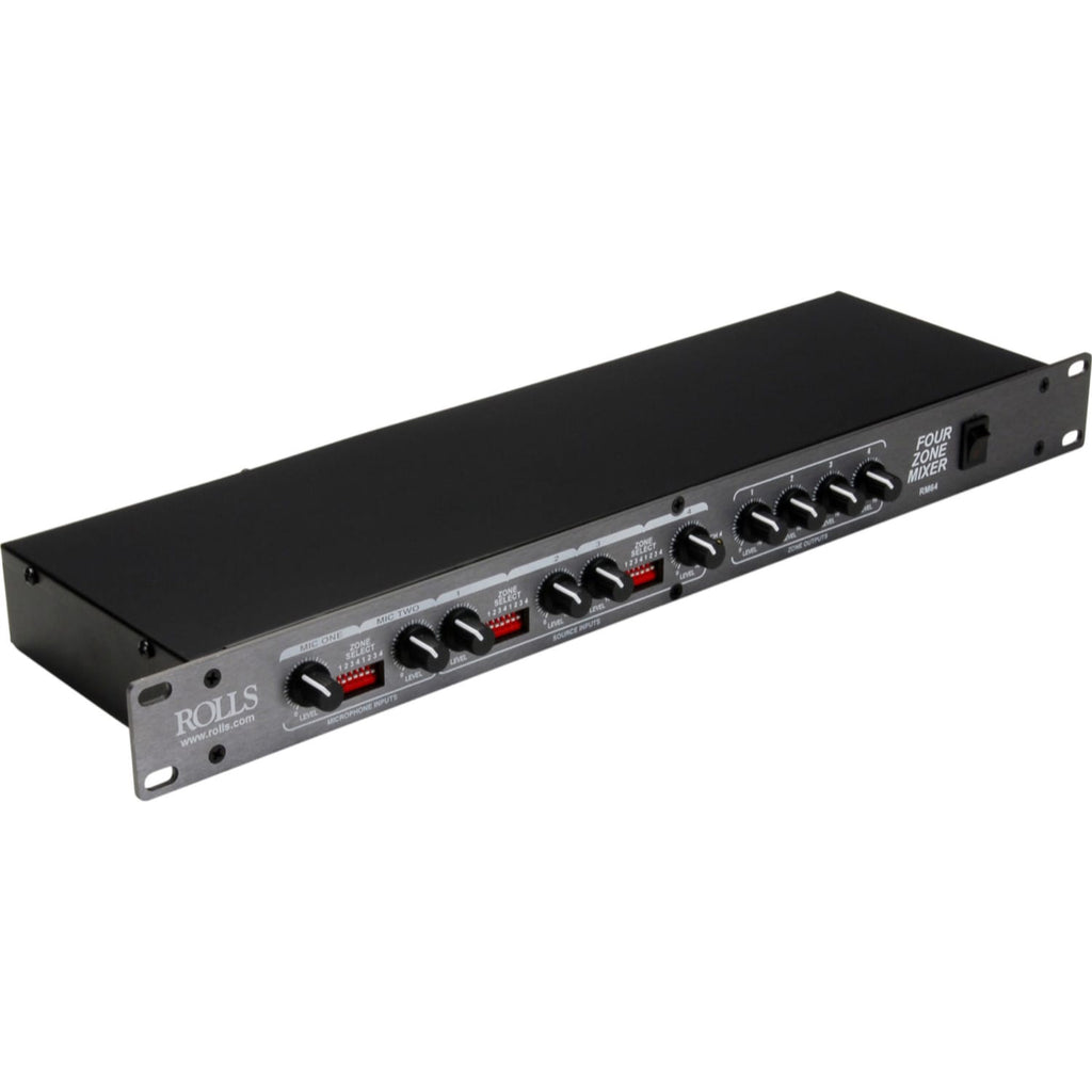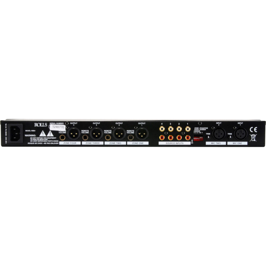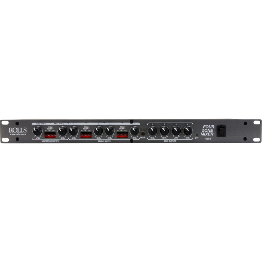 The new ROLLS RM64 Four Zone Mixer combines two paging microphones with up to four line level source inputs. Each input is switch selected to output to any combination of four zone outputs. The outputs are all balanced XLR connectors, and a 1/4" Remote Volume jack provides each zone with the means for external volume control.