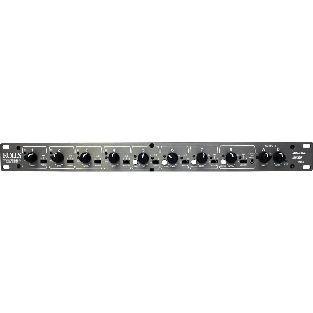 The RM85 is a 8 channel two zone mixer. Channels 1-4 will accommodate XLR microphone or XLR line level inputs. Channels 5-8 are 1/4" inputs. All 8 channels can be sent to the two XLR outputs in three configurations; A, B or both A+B. The separate A and B outputs are XLR and either can be selected to be Line or Microphone level output. Channel 8 also has a stereo 3.5mm (1/8") input on the front of the RM85.
