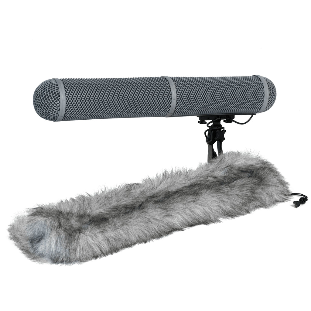 Windshield basket completely surrounds the microphone and its connector, sliding onto the suspension. High-quality synthetic fur windjammer is designed to fit perfectly over the windshield and features a drawstring and toggle for a snug fit. Windshield and windjammer attenuate up to 38 dB of wind noise.