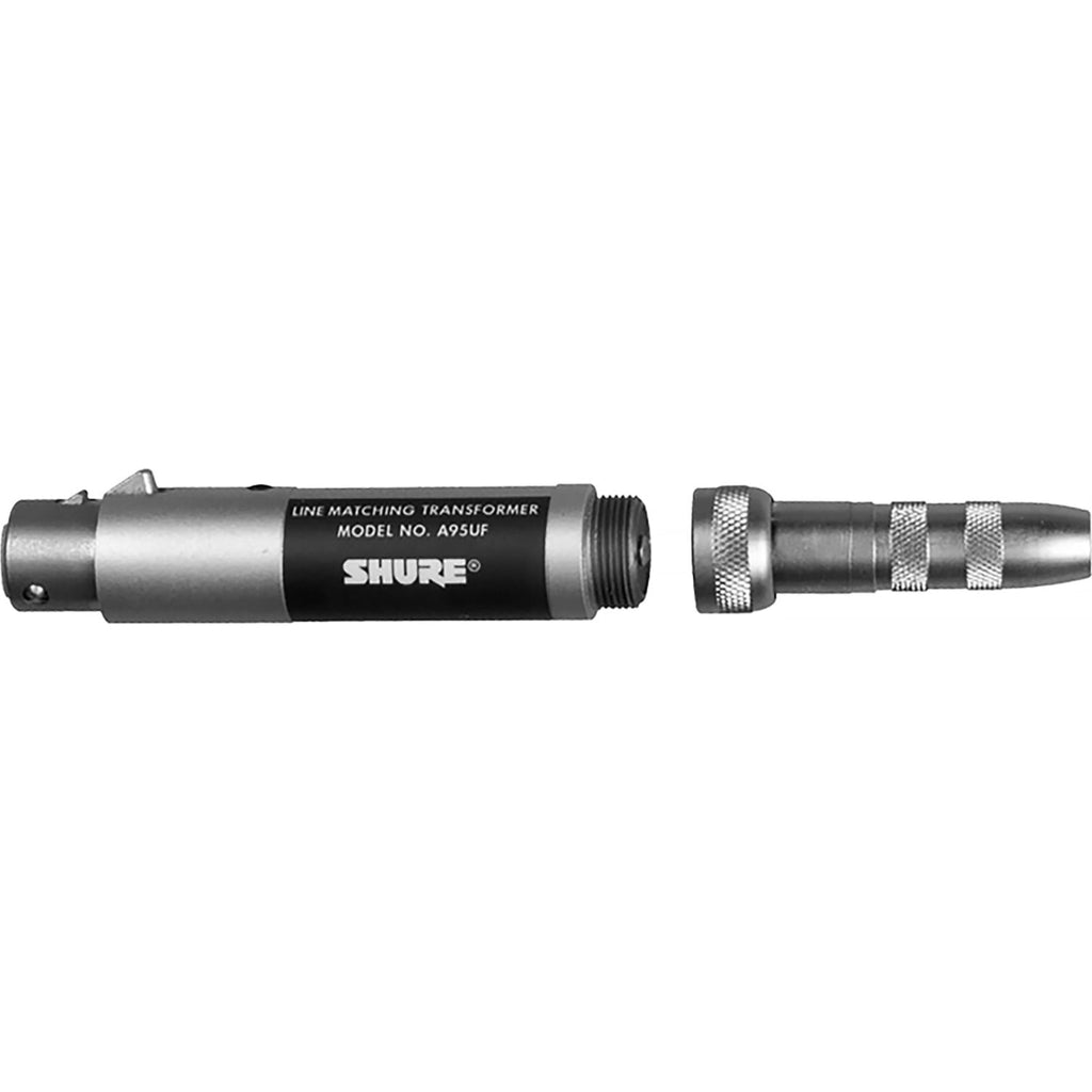 The Shure A95UF is a reversible transformer that matches low-impedance microphones to high-impedance inputs or high-impedance microphones to low-impedance inputs. The transformer permits use of very long microphone cables with either low-impedance or high-impedance microphones. The only requirement is to limit the cable to 4.6 m (15 ft) between the high-impedance end of the transformer and the low-impedance microphone or microphone input. The transformer prevents high-frequency loss, level loss, and objectionable pickup of noise or hum.