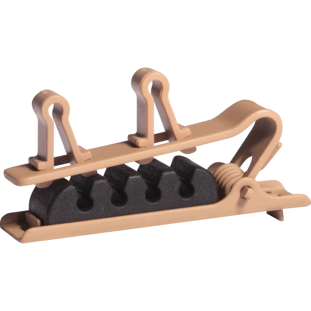 This cocoa Shure Dual-Mic Tie Clip for DL4 DuraPlex Lavalier Microphones is offered in a pack of 3 and allows you to attach two DL4 lav mics to a tie, lapel, or collar. Grooves on the inside of the clip allow you to secure the cables for strain relief.