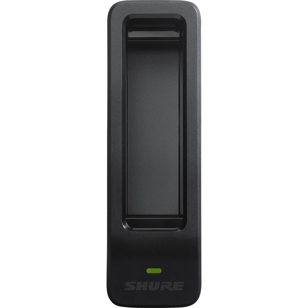 The single battery sled charger can be powered from AC power sources and USB ports to charge one Shure SB904 Lithium-Ion Rechargeable Battery for use with GLX-D+ Digital Wireless Transmitters.