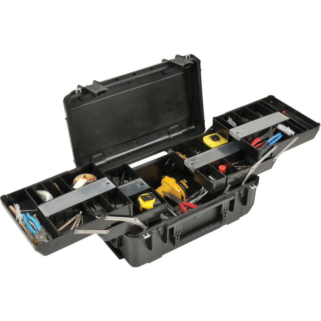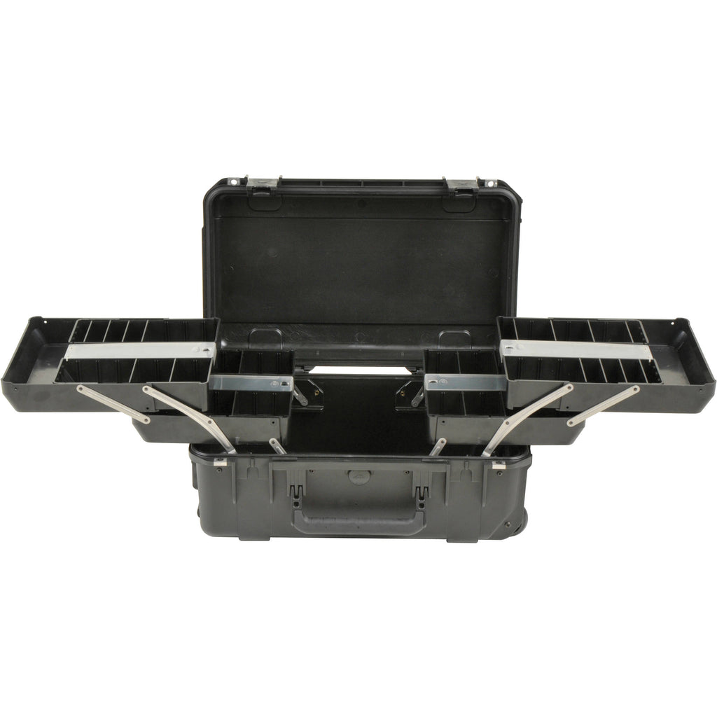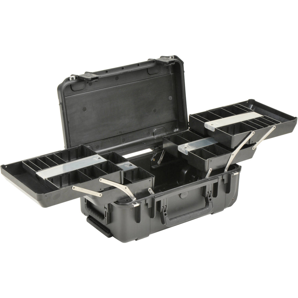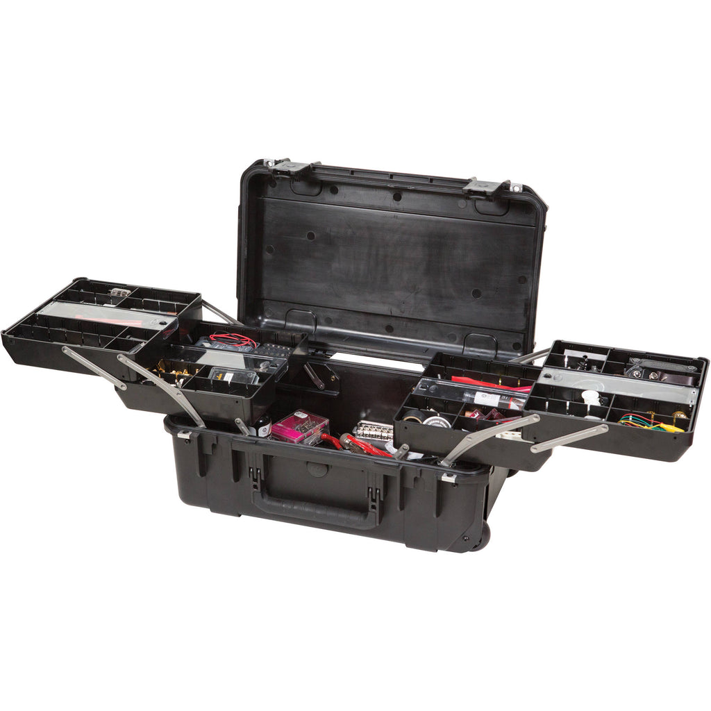 This model features fold out dual trays with plastic dividers on both sides of the case with a clear covered middle section that can be snapped down to keep connectors and other small miscellaneous pieces in place. When the case is closed the fold-out trays sit on each other keeping the contents from shifting around. The storage area below the trays measures 20.5" x 3.375" for additional storage.