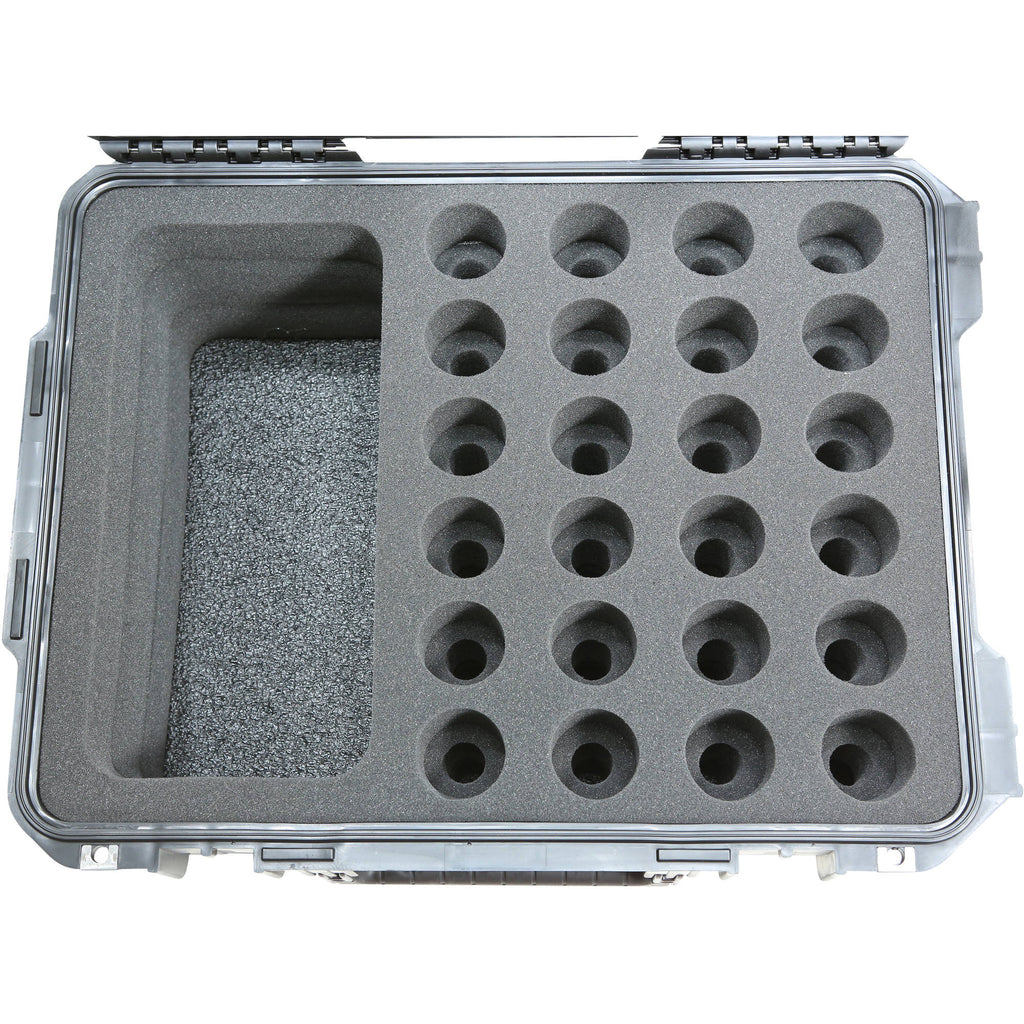 The interior foam is cut on the new water jet machine SKB is now using to cut custom foam and design new products. The case has convoluted foam in the lid for a compression fit. The 3I-2015-MC24 case also features an injection molded pull handle along with in-line skate wheels. The 3I-2015-MC24 Microphone case measures 20" x 15" x 10" deep and is covered by SKB's "MIllion Mile" Lifetime Guaranty.