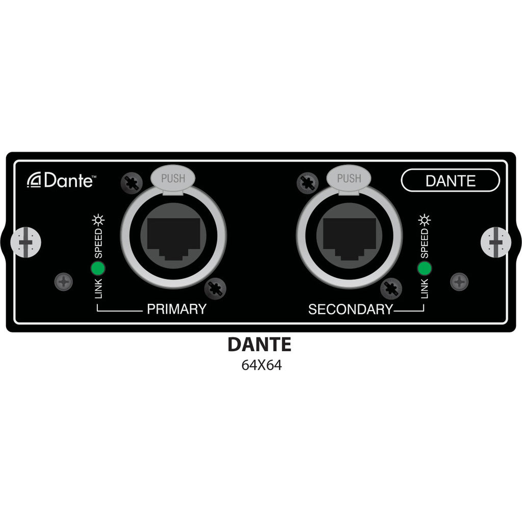 The DANTE card connects to an Audinate DanteTM network, and allows the console to send and receive up to 64 channels in each direction.