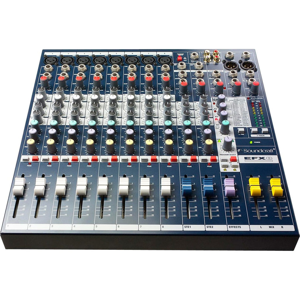 The emphasis with the Soundcraft EFX is very firmly on quality build and audio performance, with an easy to understand control surface in line with the Soundcraft professional range. The Soundcraft EFX uses the highly-transparent GB30 Mic amp (designed by Graham Blyth for the company's 30th anniversary, and also used on the larger LX7ii and GB Series professional consoles).The Soundcraft EFX also offers all the features of the Soundcraft EPM most notably a configurable aux send, XLR and 1/4" metal jack connector sockets, RCA phono stereo playback inputs and record outputs, 3-band EQ with a swept mid on the mono inputs, 3-band EQ on the 2 stereo inputs, TRS insert sockets, inserts on all mono inputs, ten-segment LED output metering and a headphone output.