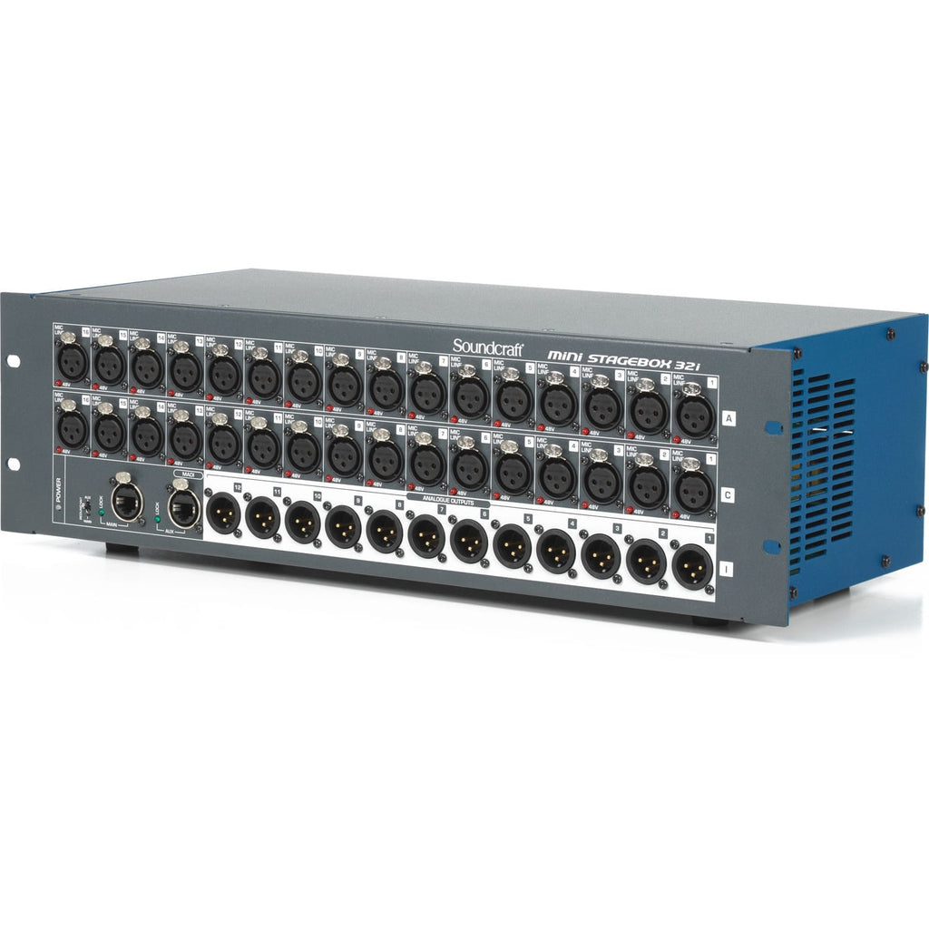 Soundcraft Mini Stagebox 32i and Mini Stagebox 16i combine high-quality components with a streamlined design, making it easy to add multiple channels of remote-controlled I/O to your Si-series mixing console. The Studer-designed mic preamps provide exceptional sound quality, while the compact form factor offers easy transport and fast configuration. Ideal for live engineers, houses of worship, bands, club owners and corporate installations, Soundcraft Mini Stageboxes allow you to replace heavy, expensive analog snakes with a single RJ45 Cat5 style Ethernet cable.