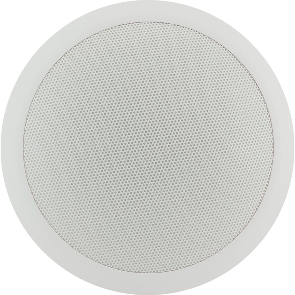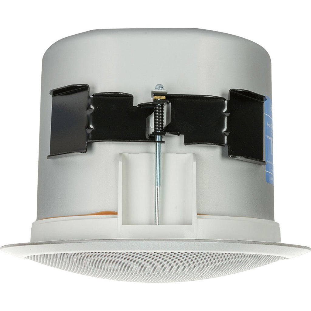One 5.25 inch polypropylene woofer and one 1.0 inch convex titanium tweeter with FerroFluid cooling mounted to a proprietary cast-aluminum baffle and heat sink. Patented BroadBeam waveguide technology delivers a consistent dispersion pattern for maximum intelligibility and edge-to-edge coverage. Rapid-installation, blind-mount, fixed wing mounting mechanism with constant tension design affixing to ceiling thicknesses ranging from 0.25 inch (6.4 mm) to 1.91 inch (48.5 mm). Easy-access six-position selectable tap switch for 25-, 70.7- and 100-volt applications with transformer bypass position. Separate tool-free magnetic grille and bezel assembly with integrated safety cable for ease of install and in-field painting. Steel grille with protective powder-coated finish for lasting durability. Average sensitivity of 86.5 dB offers high-output capabilities and reduced amplification costs. UL 1480 (UEAY) and 2043 approved.
