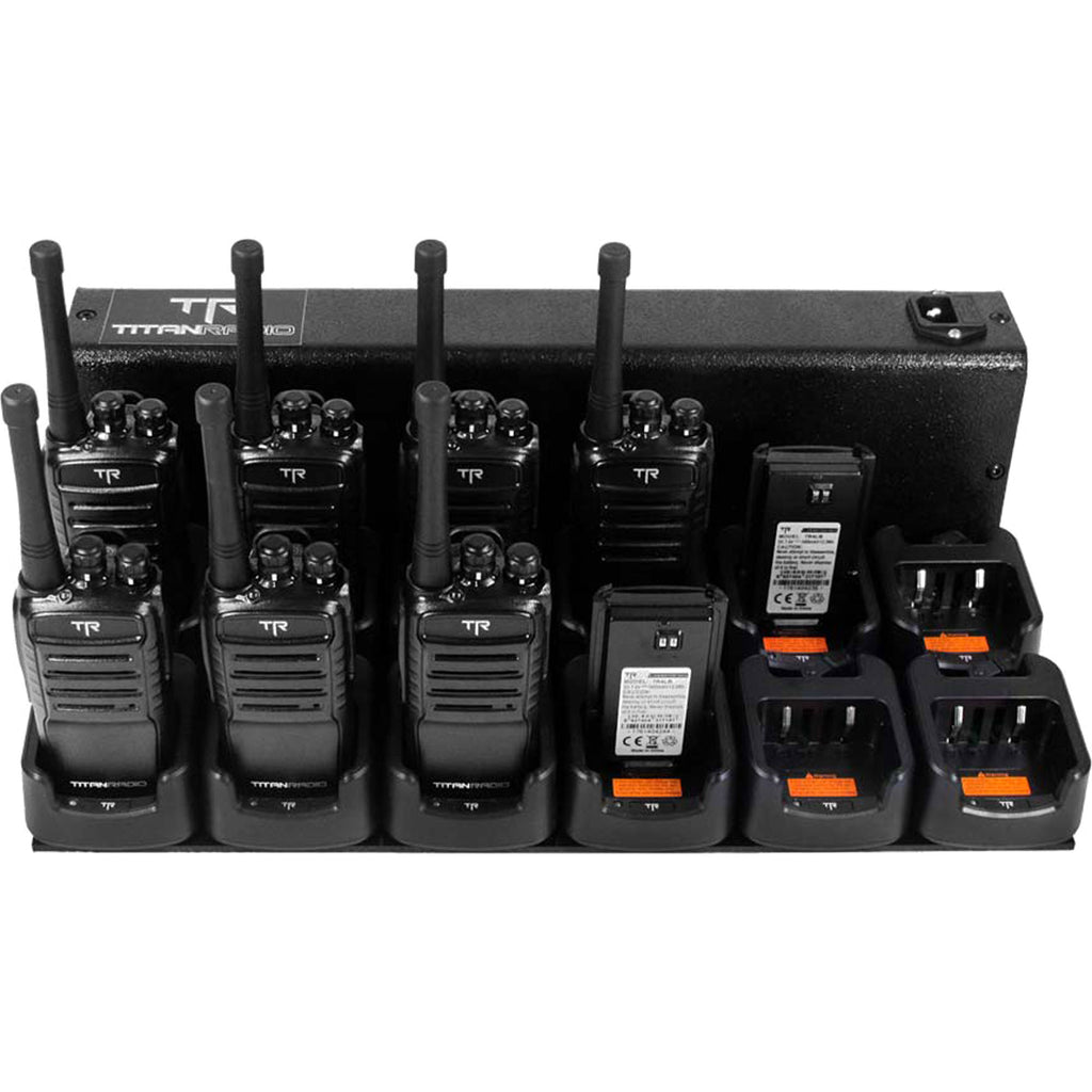 Rapid multi-unit charging station can charge up to 12 batteries at one time, with or without radios. Compact design takes a minimum amount of space. Includes power cord.