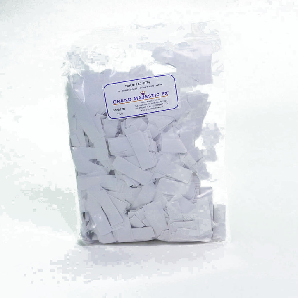 Grand Majestic FX's Pro Fetti is 5/8-inch by 2-inch rectangular paper tissue strips. When launched, Pro Fetti spins and rotates slowly, creating an impressive "cascading waterfall" effect. Pro Fetti is available in 1lb stacked packages, 10 and 25lb boxes of Free Flow.