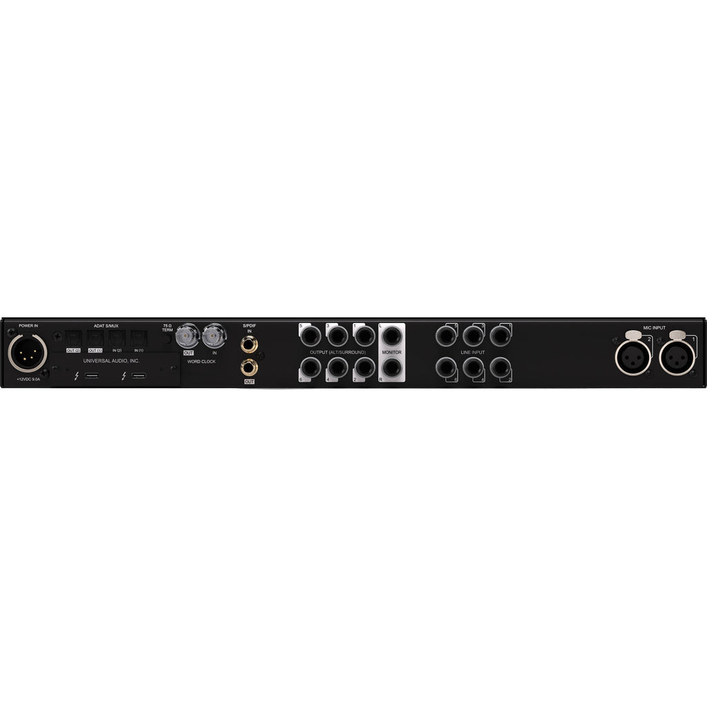 - Two Unison mic preamps, two Hi-Z instrument inputs, six 1/4" line inputs, two optical Toslink I/O (ADAT S/MUX), RCA coaxial I/O (S/PDIF), word clock I/O (BNC)