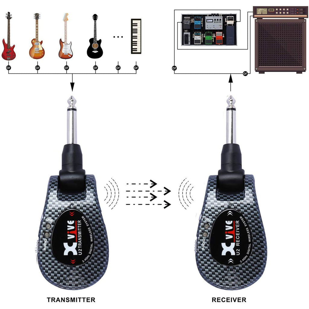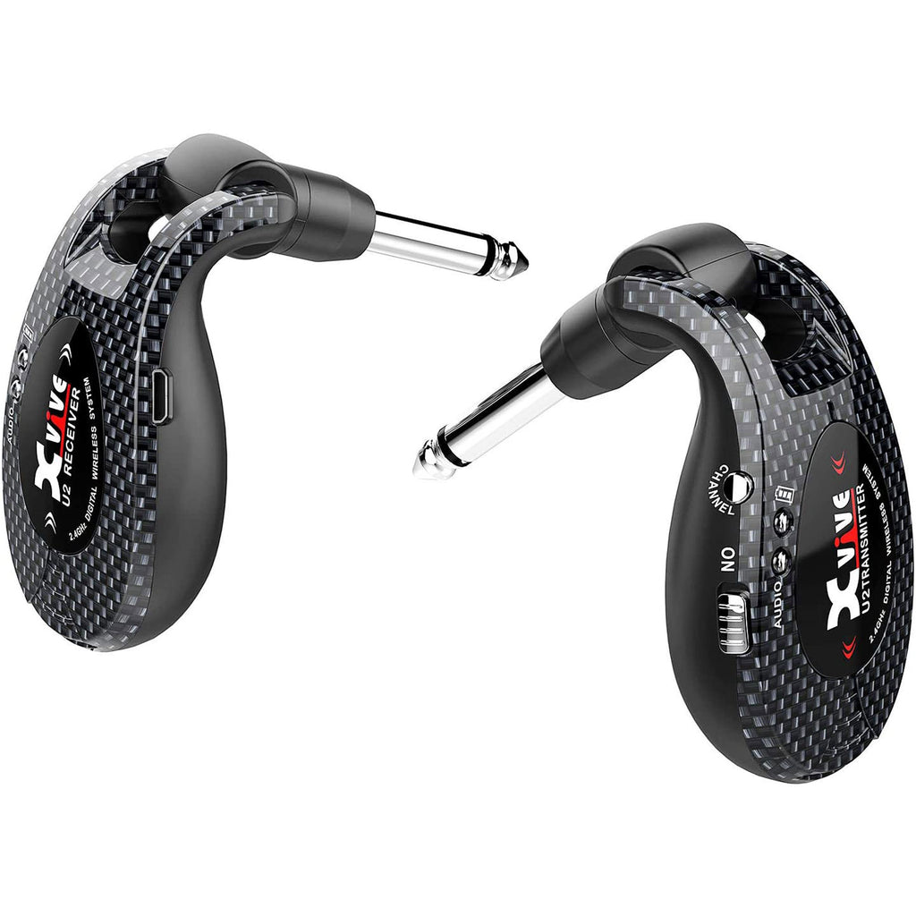 The Xvive U2guitar wireless system's digital technology delivers incredible audio quality and a super-reliable connection. It also fits in your pocket! The U2 boasts a full 20Hz-20 kHz frequency response, ensuring that you--and your audience--accurately hear the true sound of your instrument. The system has an unnoticeable 6ms of latency, which means that in addition to your tone, your groove will not be affected! The 2.4GHz ISM band offers crystal-clear wireless broadcast, ensuring the integrity of your signal over 70 feet of range onstage without any signal dropouts. The onboard Li-ion batteries help make the U2 wireless system environmentally friendly, and they last up to 5 hours per charge. The chassis is made out of durable ABS plastic that can withstand the rigors of touring and the harshest of climates. If you use effects,not only can this wireless unit run from your guitar / bass to your pedalboard, you can also use a second U2 system to run from your pedalboard to your amp! No more dodging cables on stage!