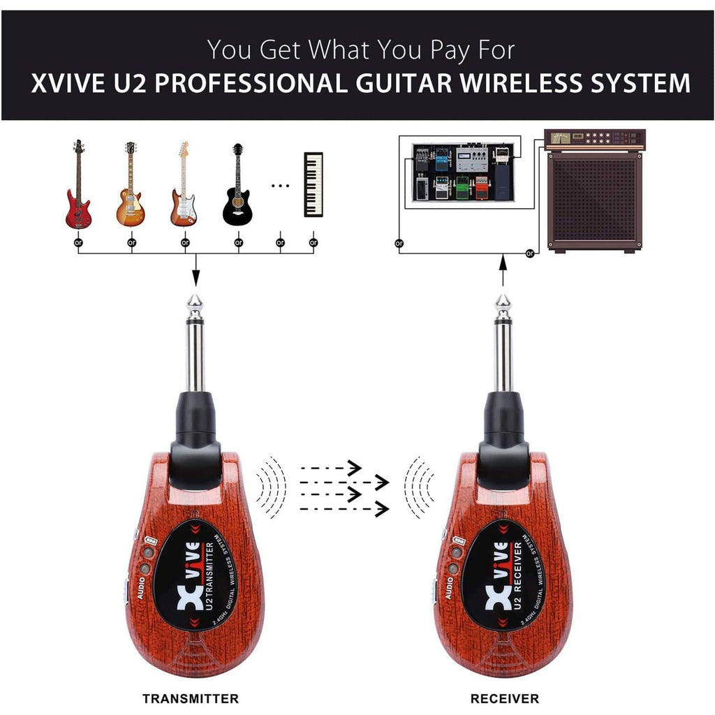 The Xvive U2guitar wireless system's digital technology delivers incredible audio quality and a super-reliable connection. It also fits in your pocket! The U2 boasts a full 20Hz-20 kHz frequency response, ensuring that you--and your audience--accurately hear the true sound of your instrument. The system has an unnoticeable 6ms of latency, which means that in addition to your tone, your groove will not be affected! The 2.4GHz ISM band offers crystal-clear wireless broadcast, ensuring the integrity of your signal over 70 feet of range onstage without any signal dropouts. The onboard Li-ion batteries help make the U2 wireless system environmentally friendly, and they last up to 5 hours per charge. The chassis is made out of durable ABS plastic that can withstand the rigors of touring and the harshest of climates. If you use effects,not only can this wireless unit run from your guitar / bass to your pedalboard, you can also use a second U2 system to run from your pedalboard to your amp! No more dodging cables on stage!